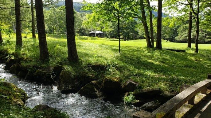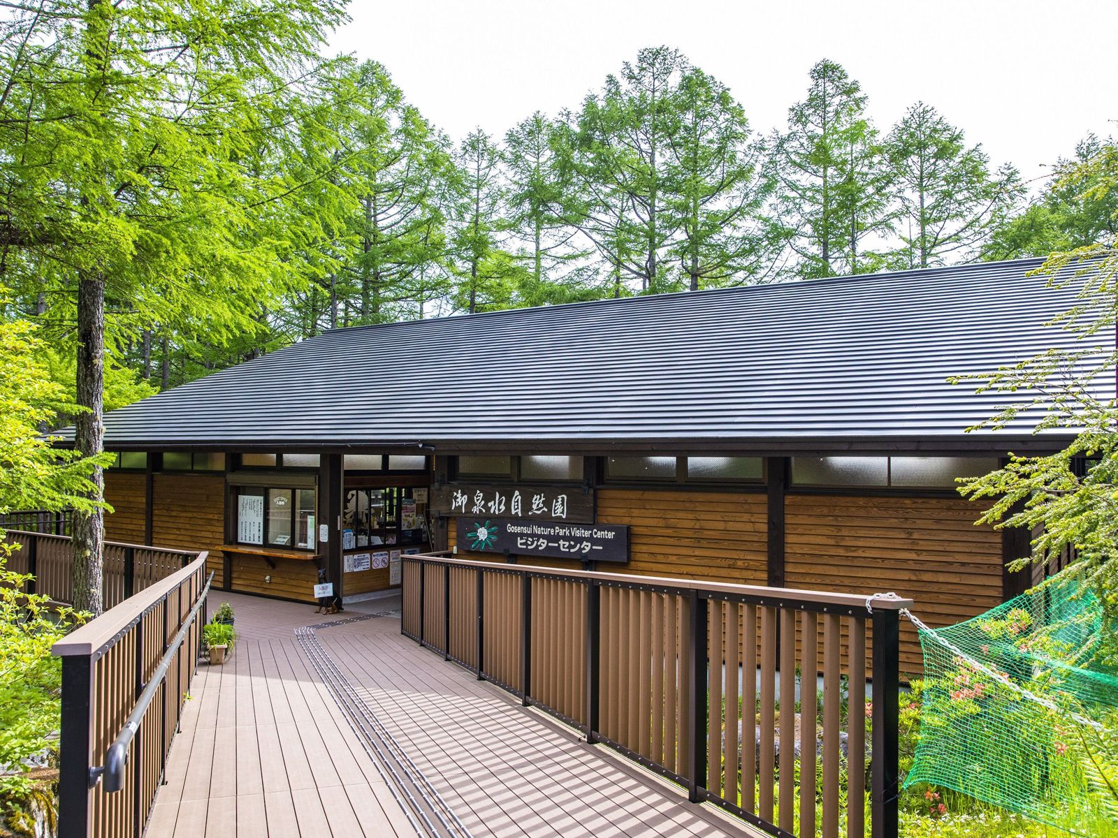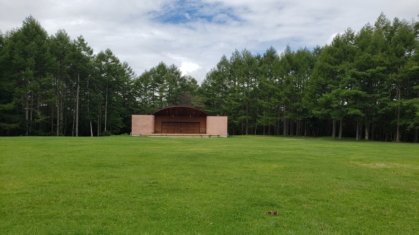 徒歩2分。小川が流れ、大きな芝生広場やあずまや、散策路があります。蓼科山が正面に見え、広々としたとても気持ちのいい場所です。自由に遊べます。