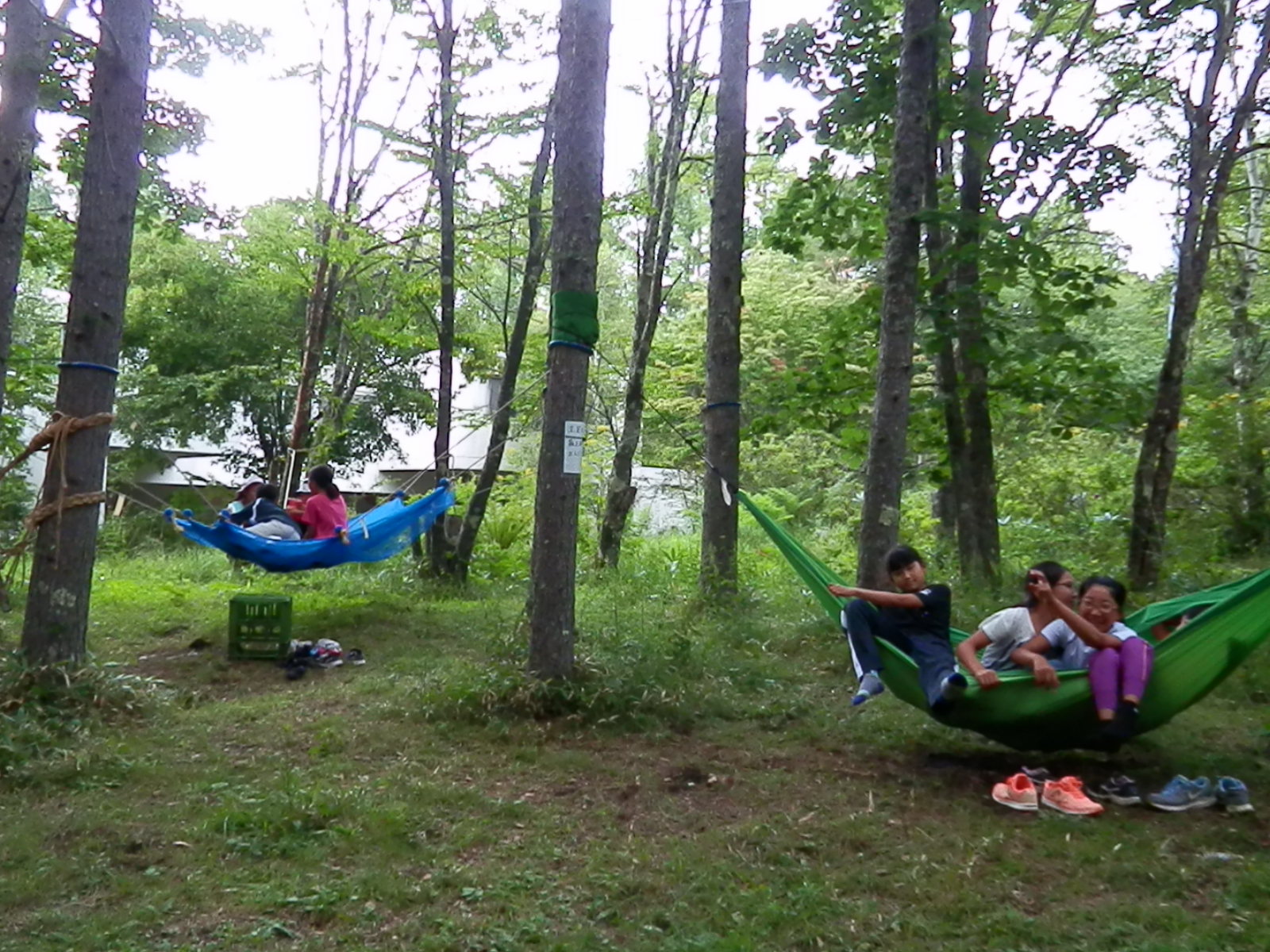 ユースホステル敷地内の森。キャンプファイアー場・野外炊飯場、屋根つきバーベキュー場があり、テント設営もできます。春~秋は、森のブランコや綱渡り、ハンモック、ターザンロープができます。